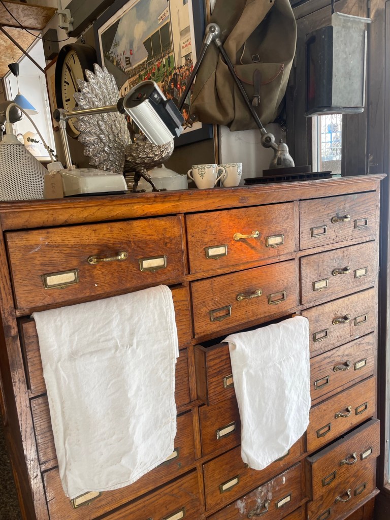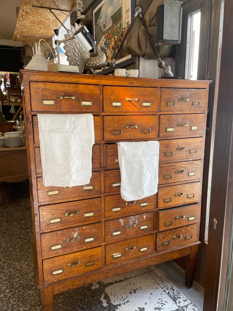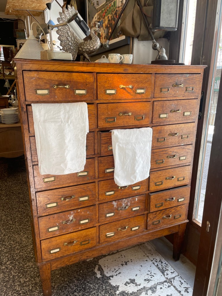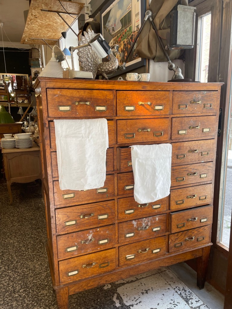 En una antigua ferretería Belga hemos encontrado esta preciosa cajonera en roble lista para decorar un rincón exclusivo …. medidas 110 ancho x 45 fondo x 149 alto .