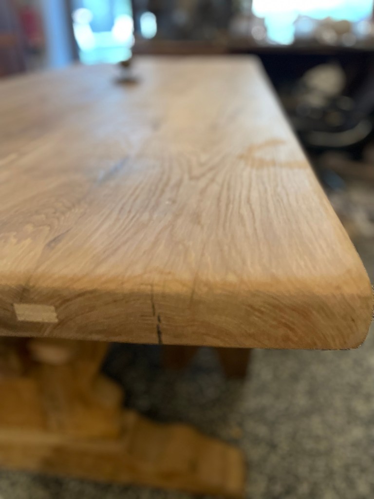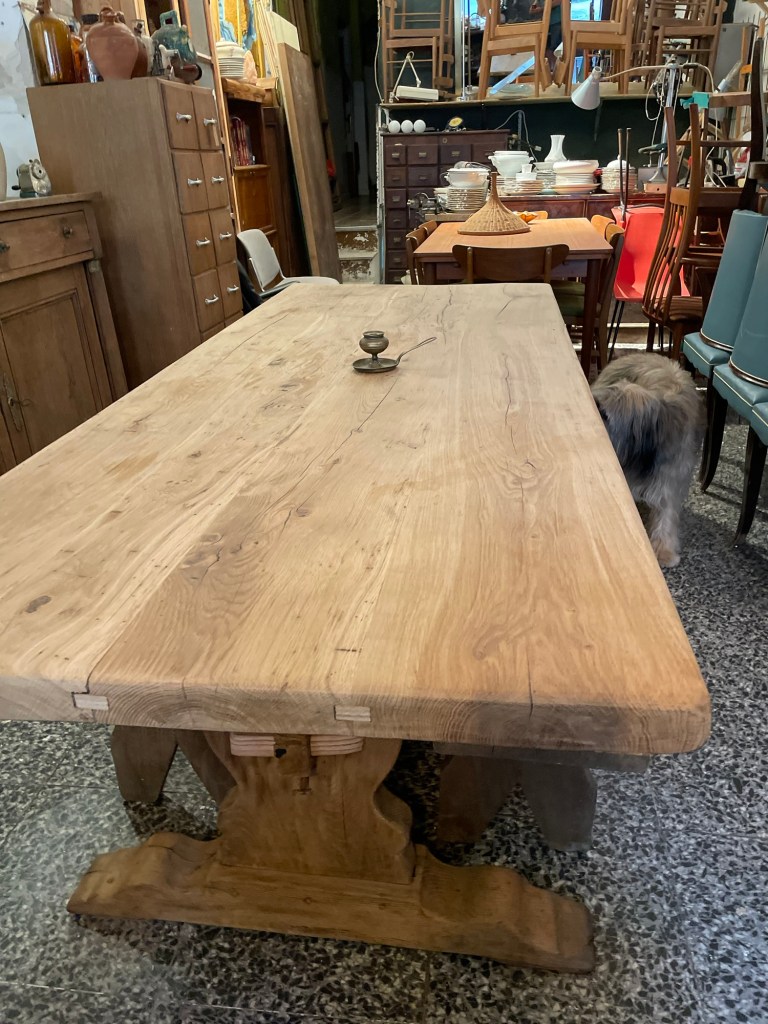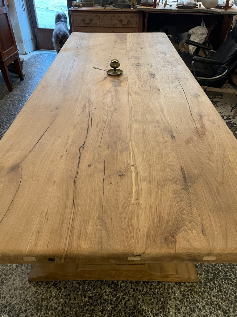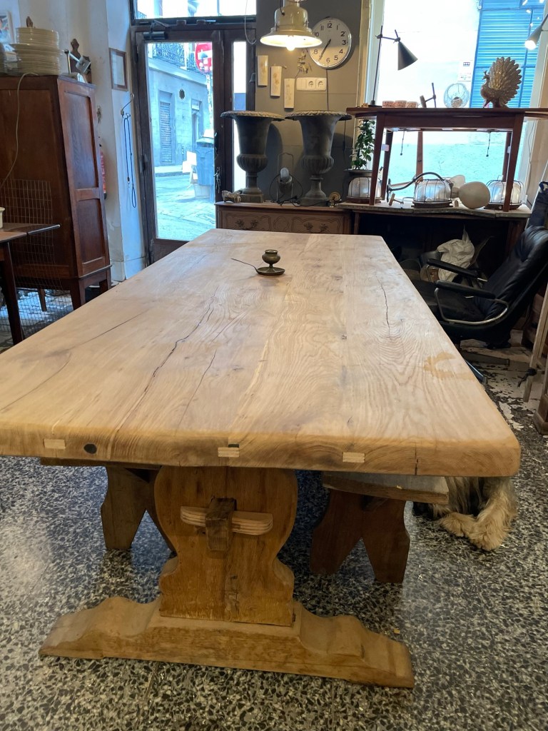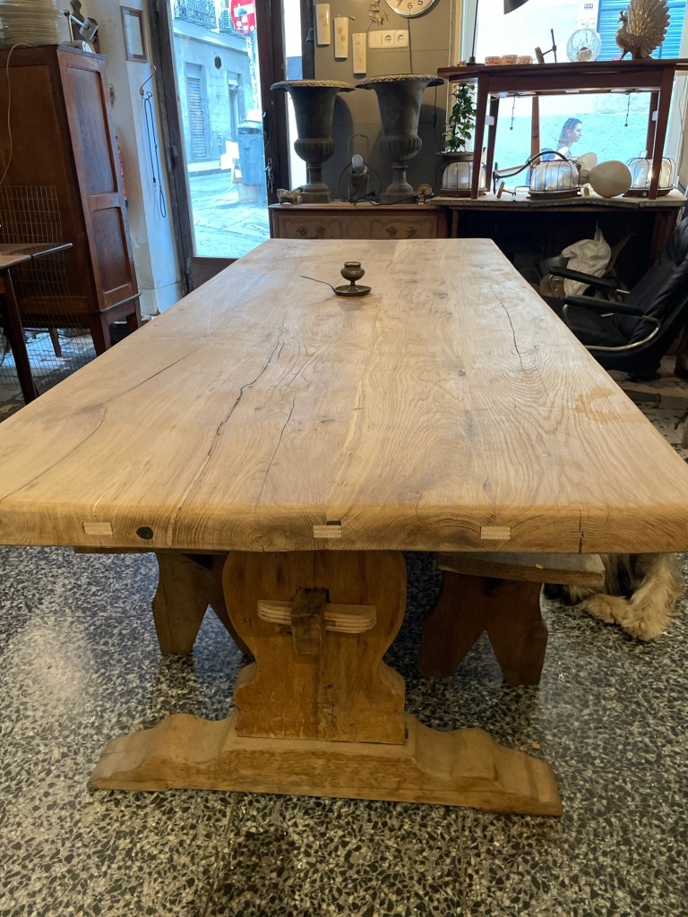 Pieza única y con carácter: esta magnífica mesa está elaborada en roble macizo, datada a principios del siglo XX. Su imponente estructura y acabados rústicos evidencian la nobleza del tiempo y la calidad de la artesanía tradicional. El sobre presenta un hermoso veteado natural, con un grosor y robustez excepcionales, y conserva los ensambles originales reforzados con injertos visibles que añaden autenticidad y encanto.